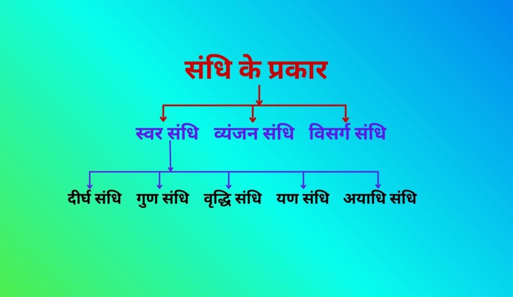 हिंदी व्याकरण में संधि के तीन प्रकार होते हैं- (1) स्वर संधि, (2) व्यंजन संधि, (3) विसर्ग संधि